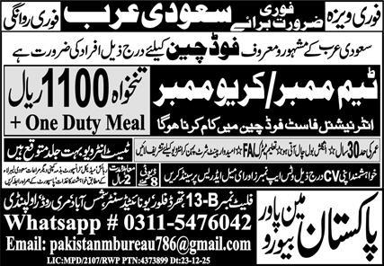 A well-known Food Chain in Saudi Arabia is urgently looking for hardworking and motivated individuals to join their team. This is a great opportunity for candidates who want to build their careers in the hospitality and food service industry abroad.